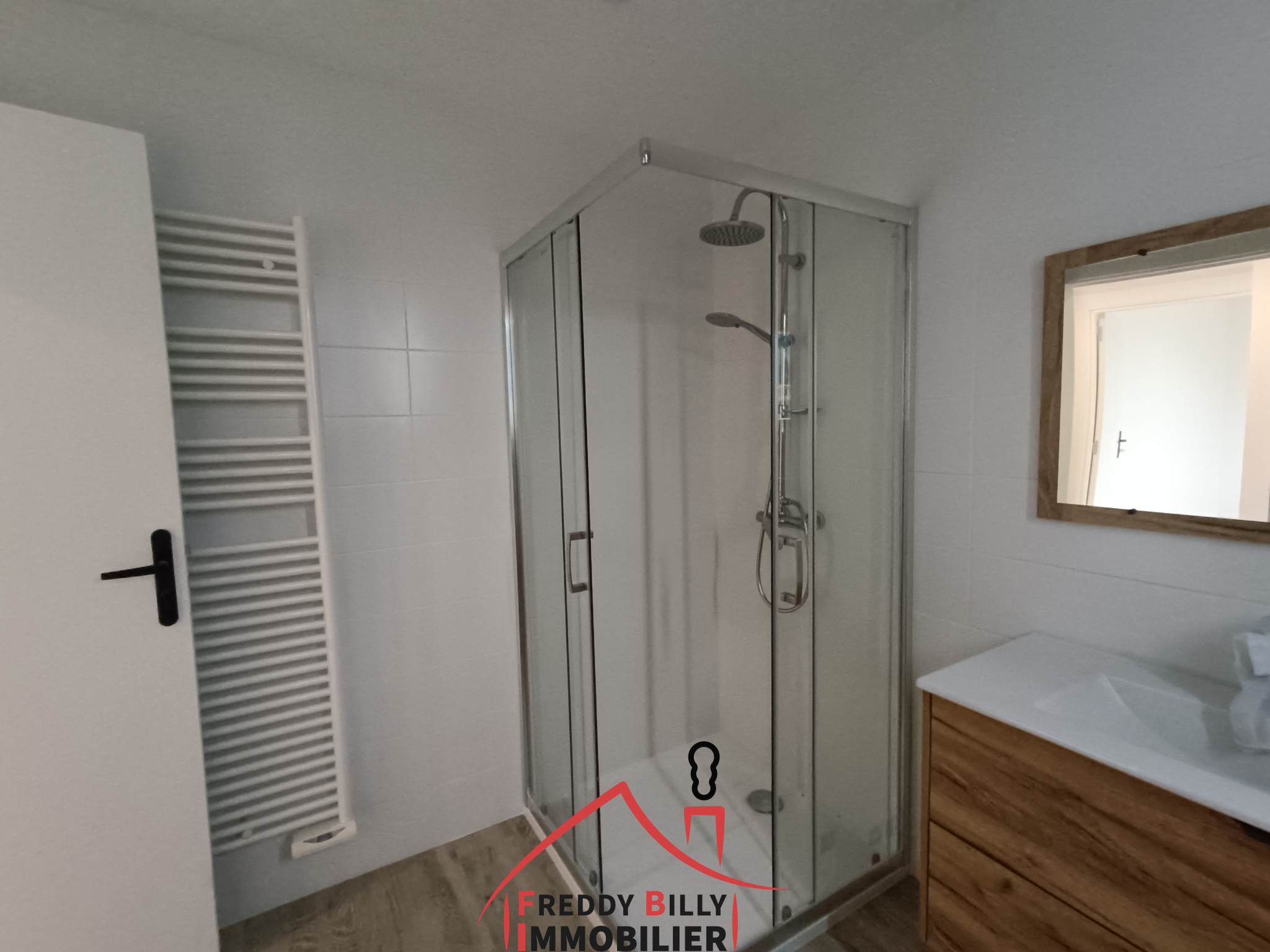 Elle se compose d'un salon-séjour, cuisine aménagée et équipée, deux chambres, un WC indépendant et son lave-mains, une salle d'eau avec douche et vasque. Cellier